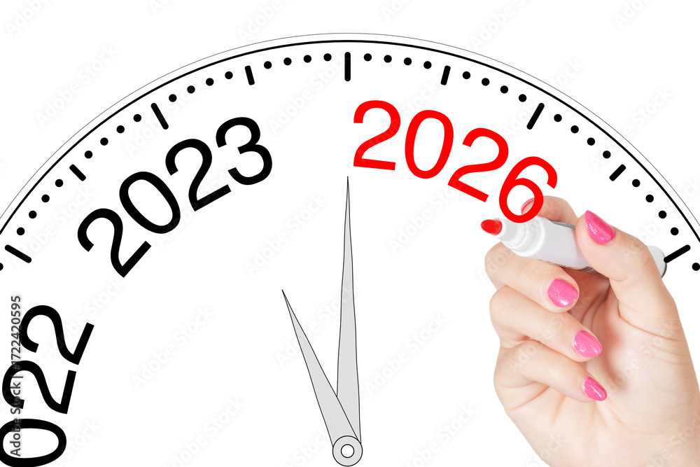 Woman Hand Writing New 2026 Year Message with Red Marker on Transparent Wipe Board. 3d Rendering
