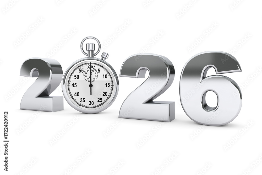 New year 2026 concept. 2026 steel sign with stopwatch . 3d Rendering