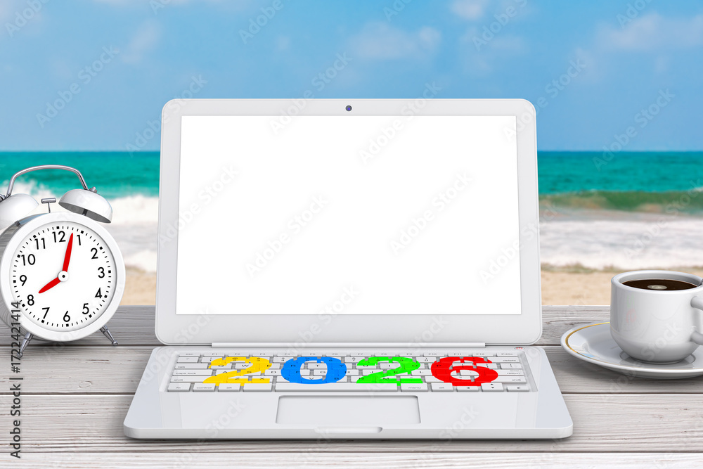 Modern Laptop with New 2026 Year Sign, Cup of Coffee and Alarm Clock in front of Ocean. 3d Rendering