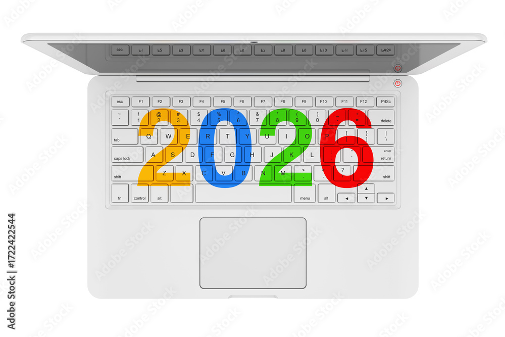White Laptop with 2026 New Year Sign. 3d Rendering