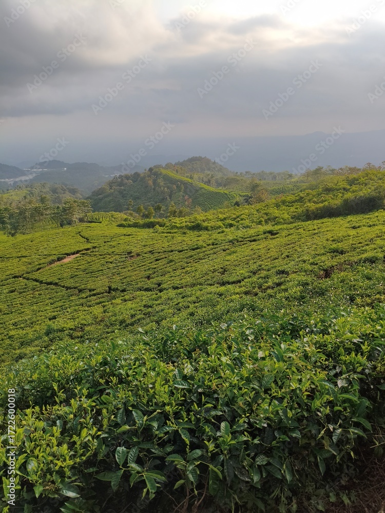 Lush green tea plantation sprawling across rolling hills under a cloudy sky.