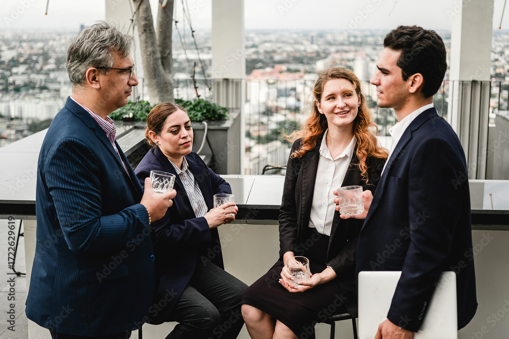 Diverse coworkers network on rooftop terrace with city skyline, chatting over drinks after work. Scene reflects partnership, leadership, collaboration, planning, seminar vibes, and brainstorming.