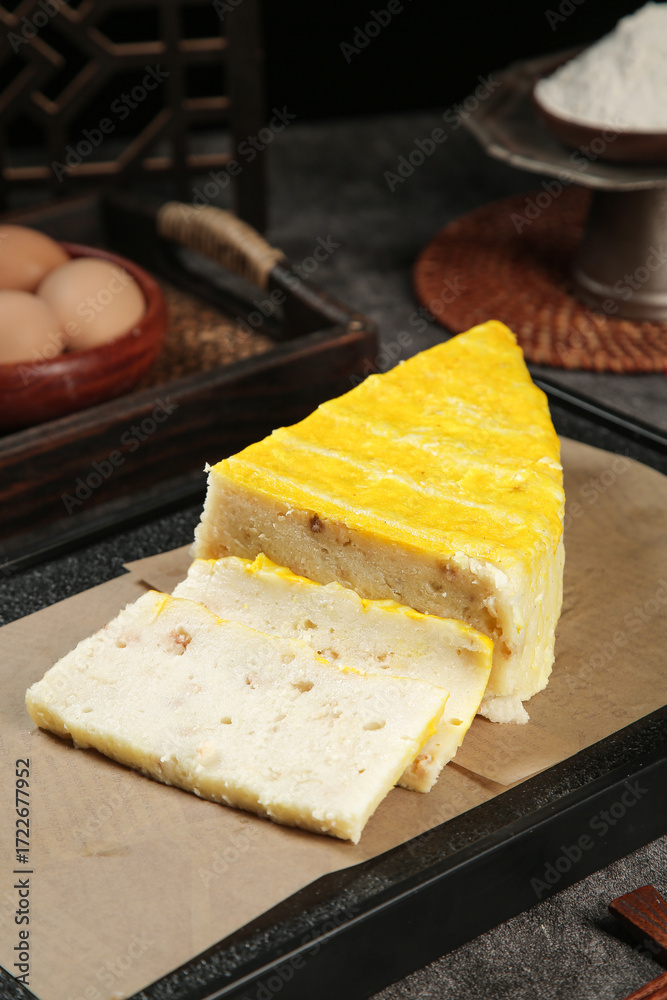 Hubei Specialty Layered Cake Traditional Chinese Handmade Dessert Being Sliced Golden Yellow