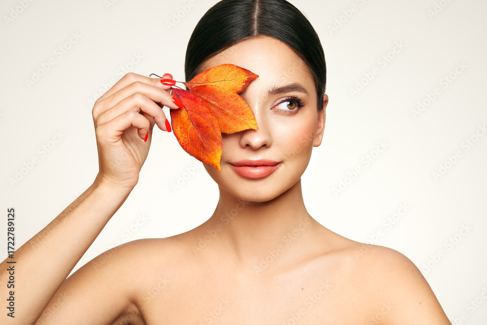 Portrait of beautiful young woman with autumn leafs. Healthy clean fresh skin natural make up beauty eyes and red nails