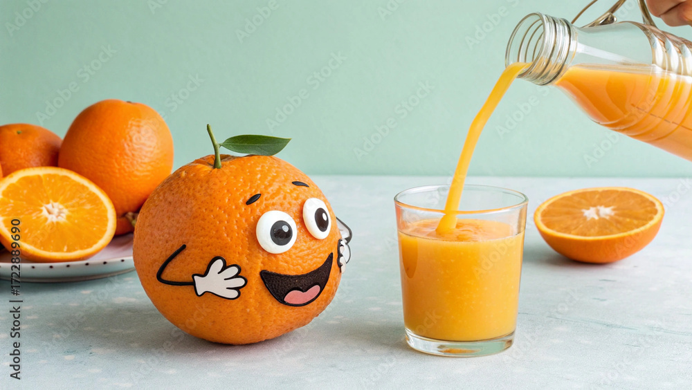 Cute anthropomorphic orange holding a jug and pouring golden citrus juice into a clear drinking glass, staged in a bright minimal background, stock photo style with fun character design.