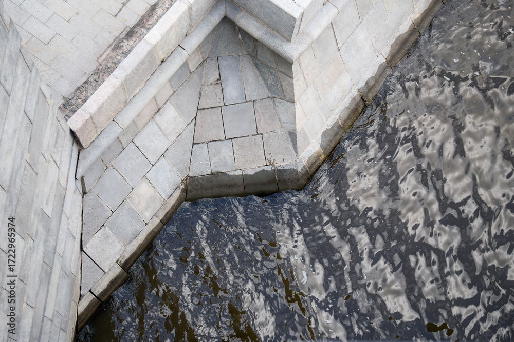 Aerial view of a granite embankment alongside a river with dark, wavy water