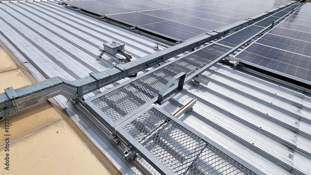 The perspective of Pyranometer Solar Radiation Sensor installation with walkway for solar rooftop system, A pyranometer is used for measuring solar irradiance on a planar surface.