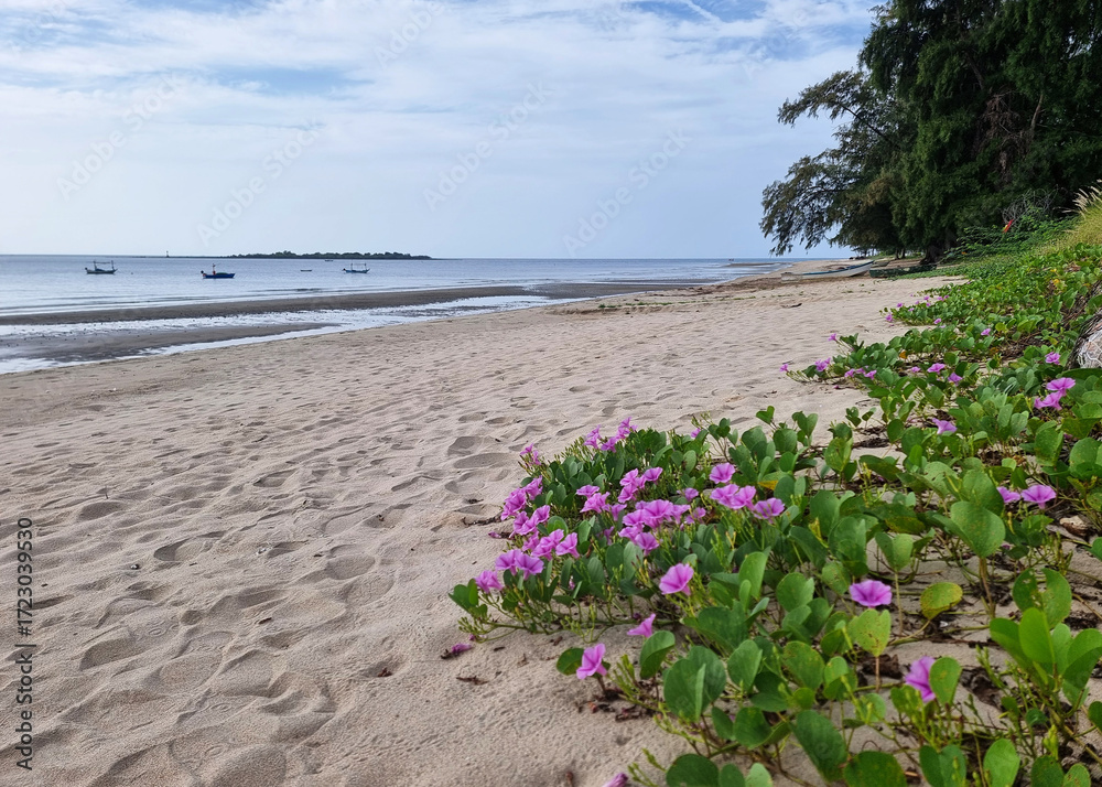 The perspective of the beach with the Katang-katang flower creeper on sandy beach.