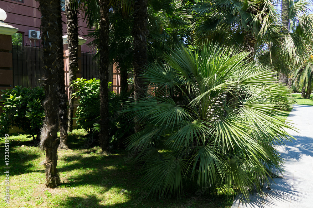 Tall Chinese windmill palm (Trachycarpus fortunei) trees and lush green foliage create a tropical pathway beside building, casting gentle shadows on grass and pavement in warm sunlight