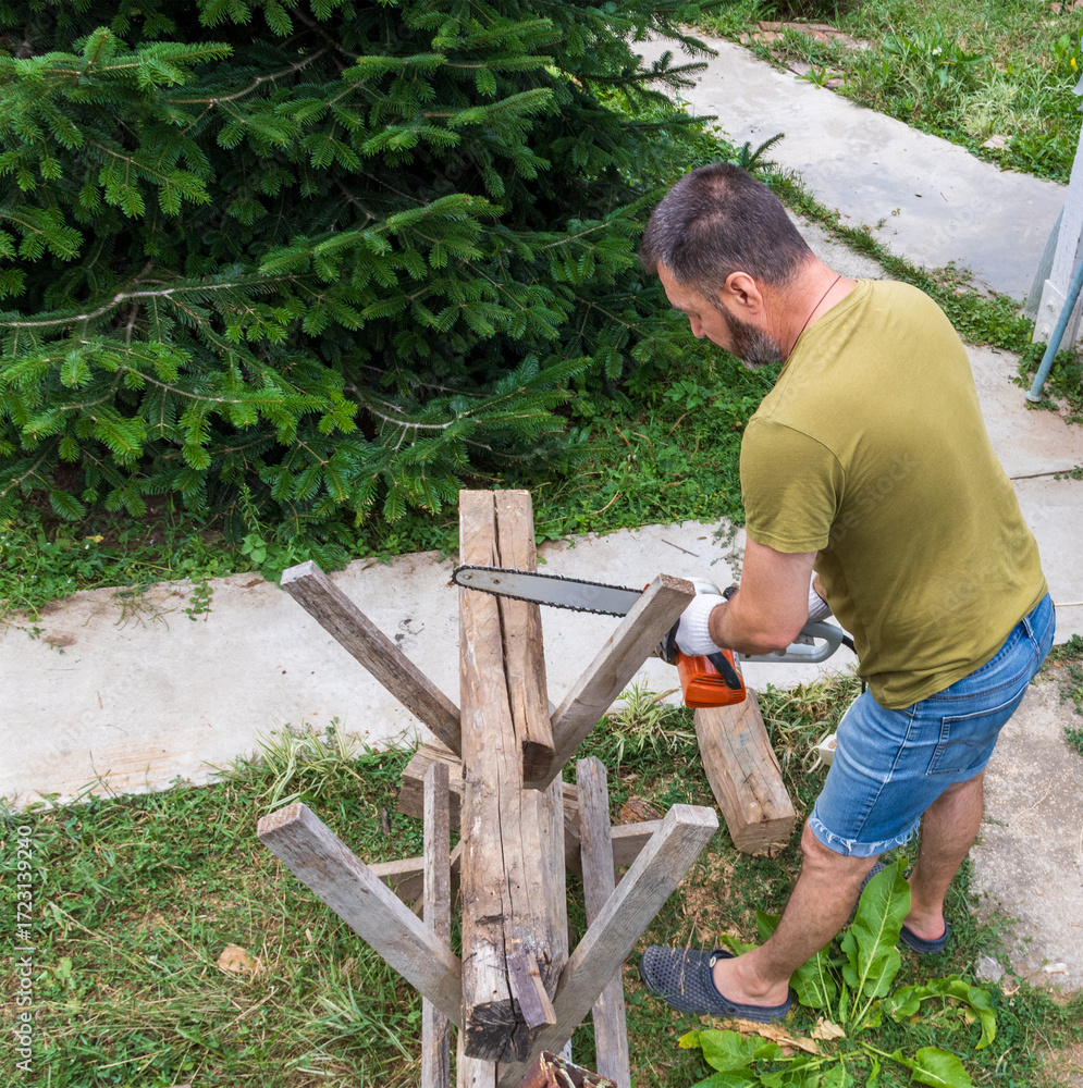 An adult man saws a log with an electric saw in a rural courtyard on a summer day