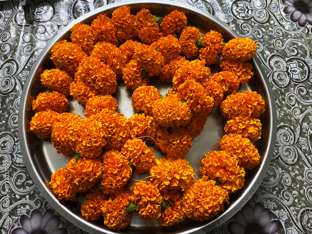 Fresh orange marigold flowers rest gracefully on a steel plate, their vibrant petals glowing against the metallic sheen.