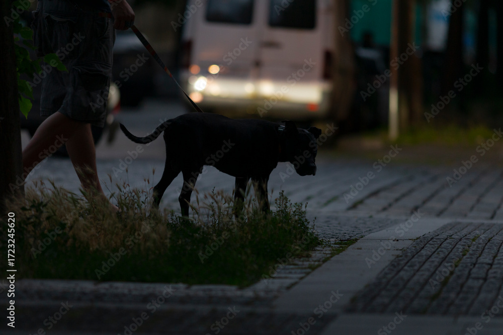 In a serene urban environment at dusk, a person strolls with their dog, showcasing the beautiful bond between humans and animals, a true example of companionship amid natures tranquility