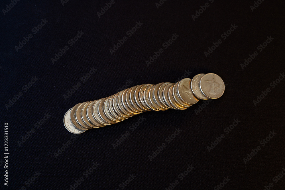 Neatly Stacked UAE Dirham Coins Symbolizing Finance and Savings.