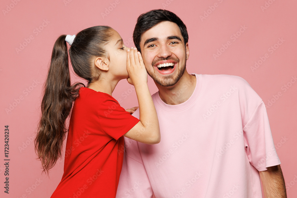 Young parent man with child girl wear red clothes. Daddy little kid daughter whisper gossip tell secret behind her hand share news isolated on plain pink background. Father's Day Love family concept.