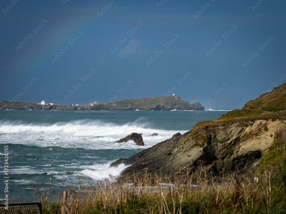 Surf and waves Mawgan Porth north Cornwall England near Newquay and south of Porthcothan and Treyarnon on a summer day with blue sk