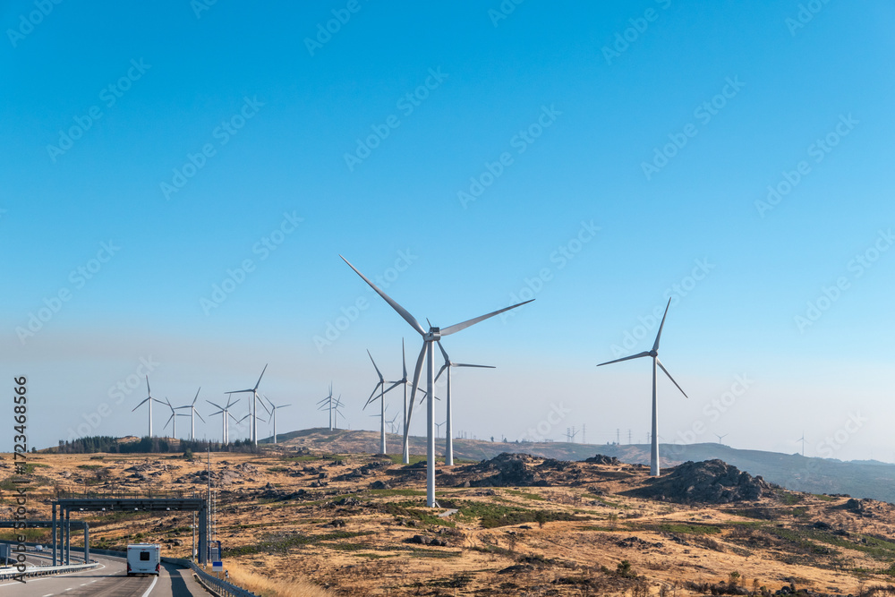 Turbinas eólicas na Serra do Montemuro sob um céu azul, ao lado de uma autoestrada, simbolizando a energia renovável e o futuro da energia eólica em Portugal