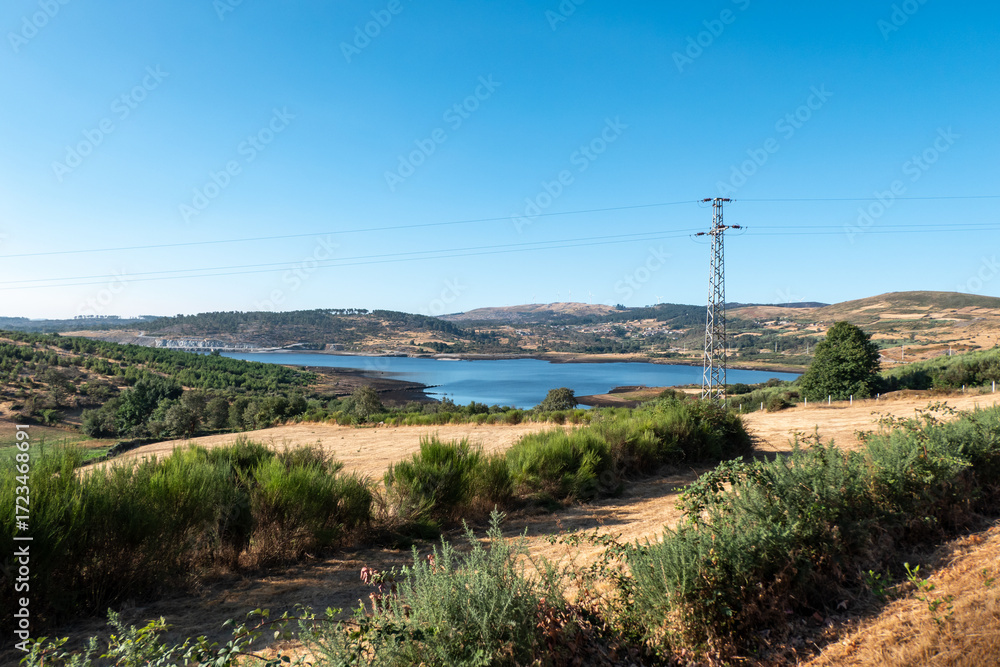 Vista deslumbrante da barragem de Gouvães com um poste de alta tensão e a Serra do Alvão ao fundo em Portugal