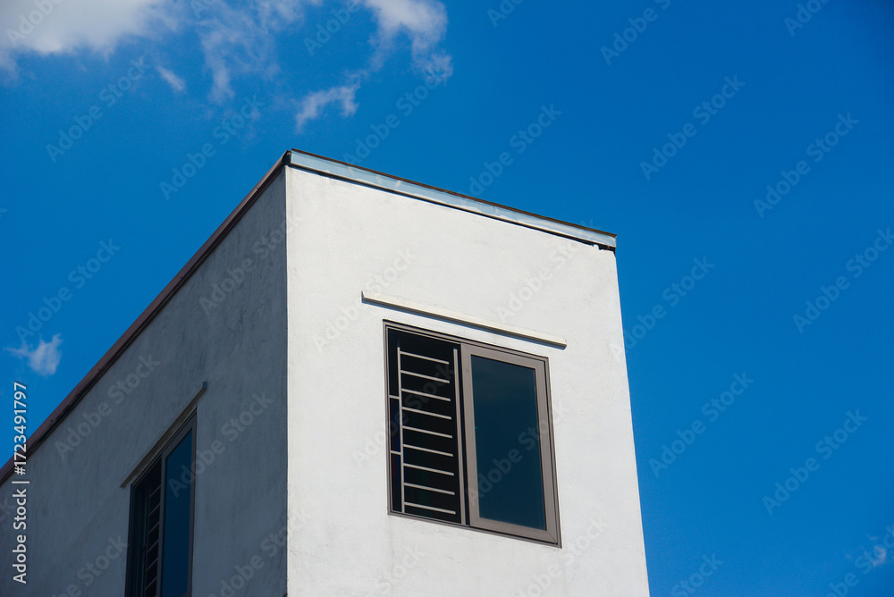 Minimalist modern building corner with clean white walls and dark window frames under bright blue sky, in Vietnam