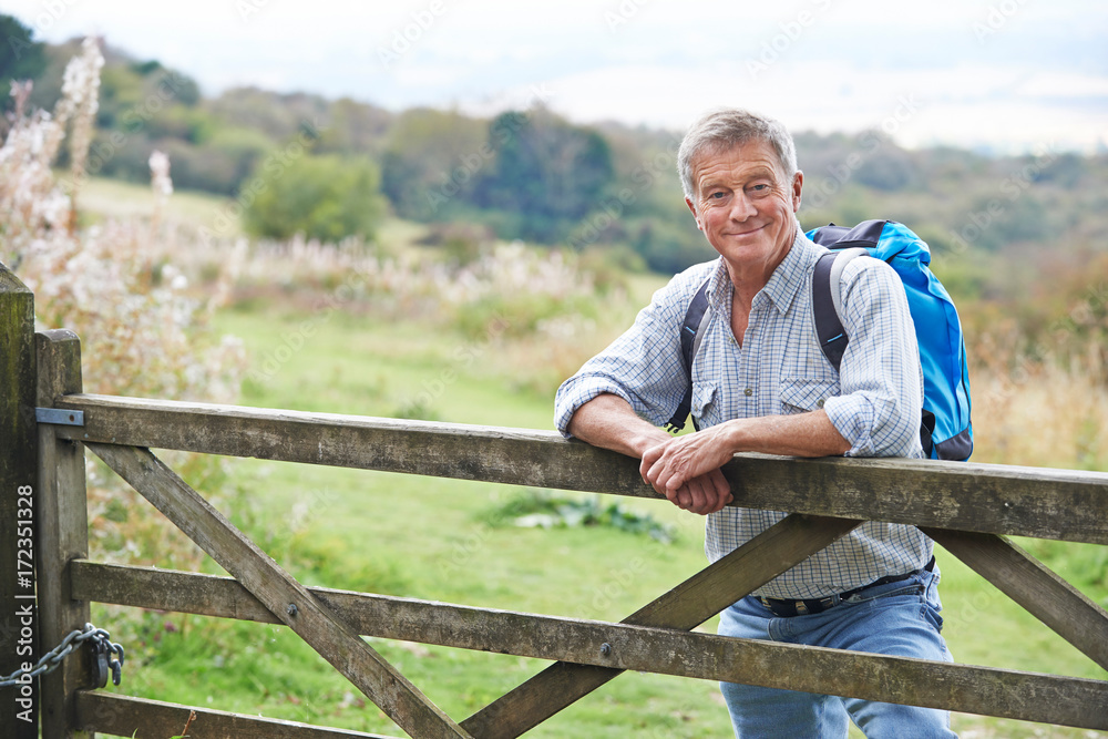 Portrait Of Senior Man On Hike In Countryside Resting By Gate