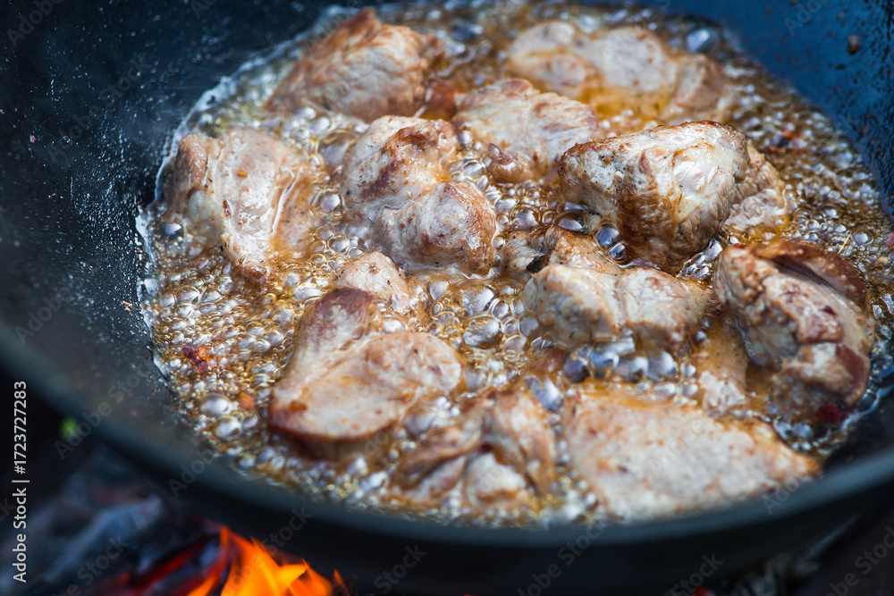 Cooking recipe for cooking meat in a cast-iron cauldron outdoors. Cooking food. Frying meat.