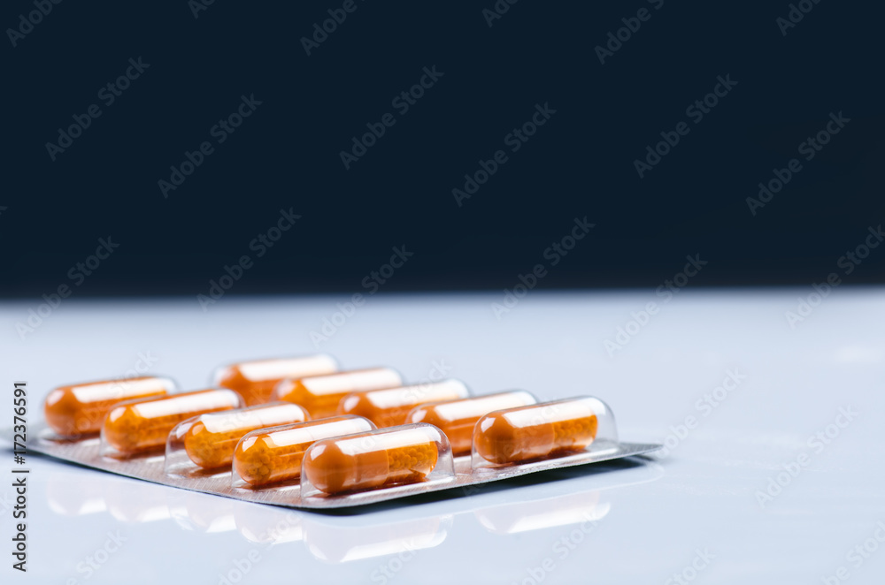 Pack of tablets isolated on a white background. Reflection of pills on a glass. Medicine´s background. Pharmacy. Close up of capsules.