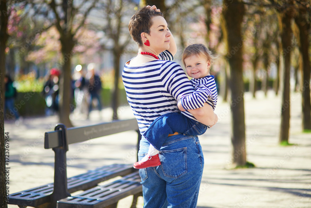 Beautiful young mother and her adorable toddler daughter walking together in park in Paris, France.