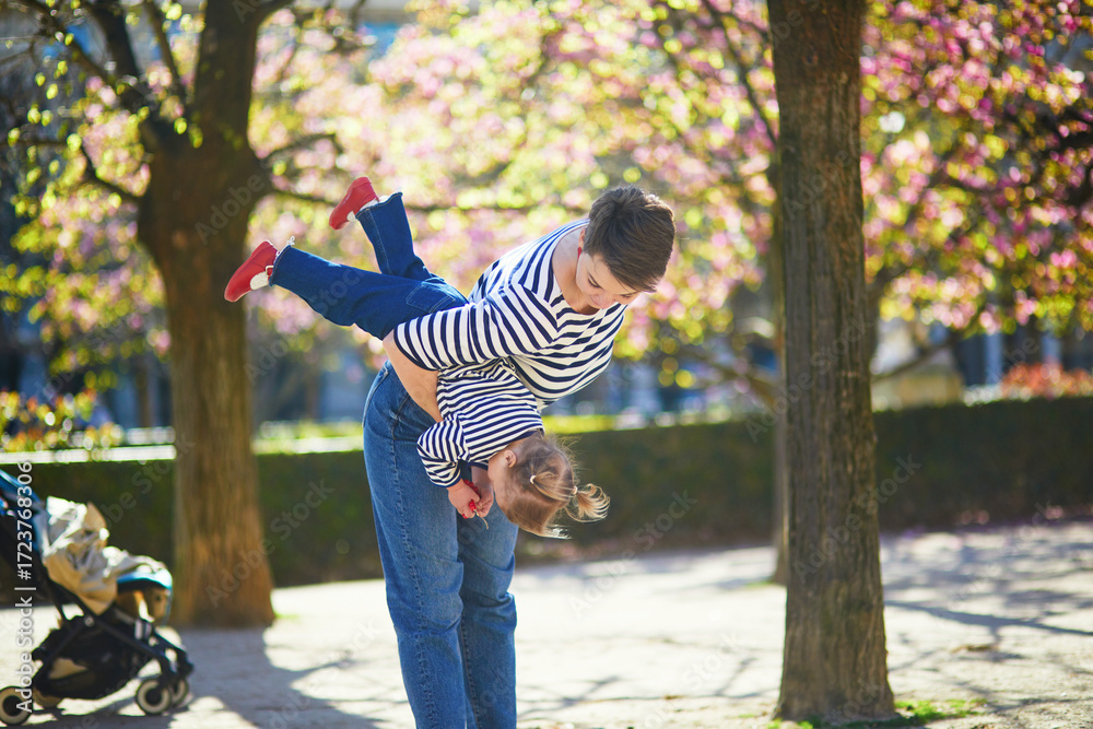 Beautiful young mother and her adorable toddler daughter walking together in park in Paris, France.