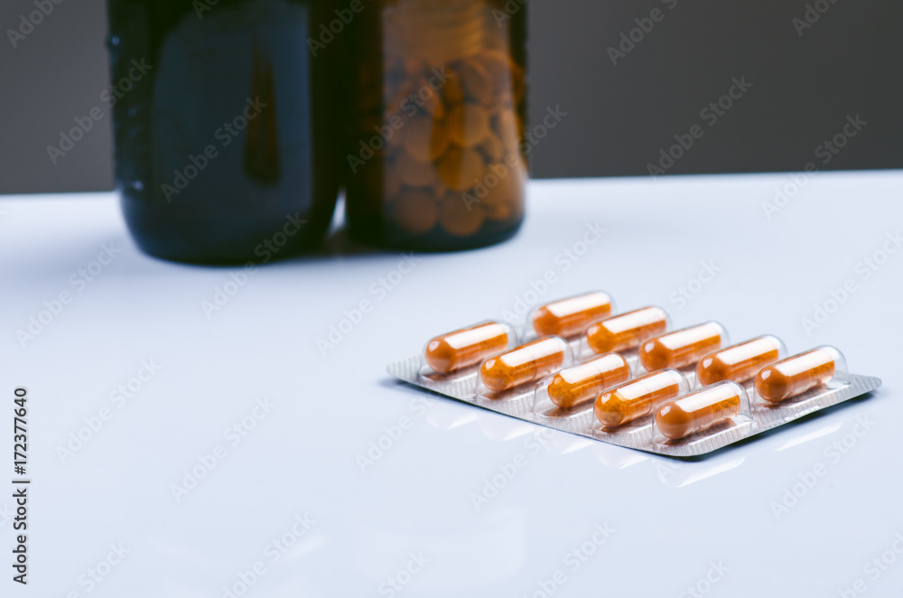 Pack of tablets isolated on a white background. Reflection of pills on a glass. Medicine´s background. Pharmacy. Close up of capsules. Medicines, supplements in a glass bottle.