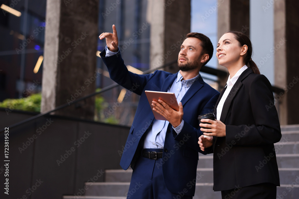 Coffee to go. Woman with paper cup of drink and her business partner during meeting outdoors, space for text