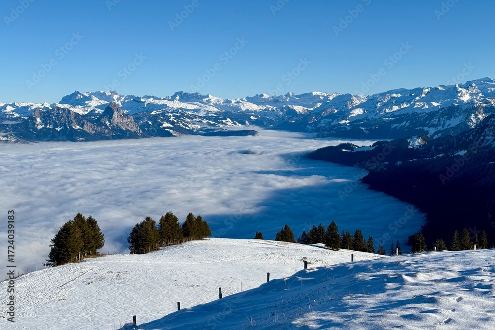 View from Mount Rigi of the snowy landscape and the sea of fog in winter. Swiss mountain landscape.