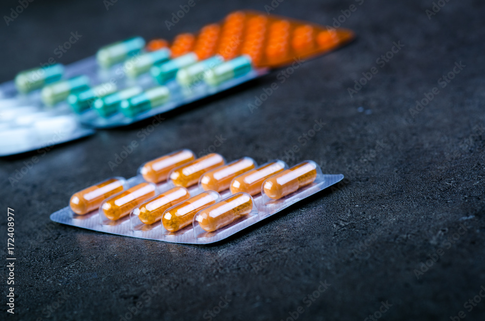 Pharmacy background on a black table. Pack of tablets on a black background. Pills. Medicine and healthy. Close up of capsules. Different kind of pills