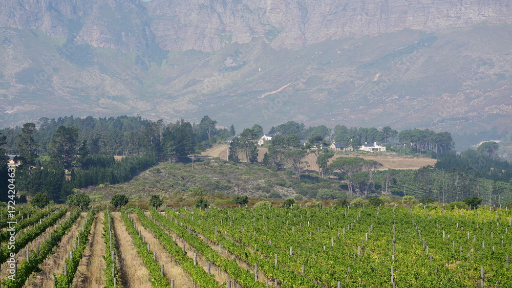 Beautiful vineyard with green grape rows against a backdrop of majestic mountains, South Africa. Concept of wine production, agriculture, nature tourism, eco travel, and rural lifestyle