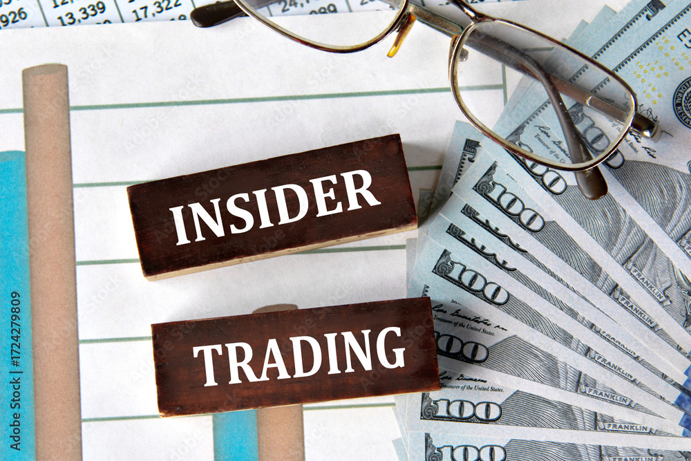 INSIDER TRADING - words on brown wooden blocks on the background of a graph and banknotes