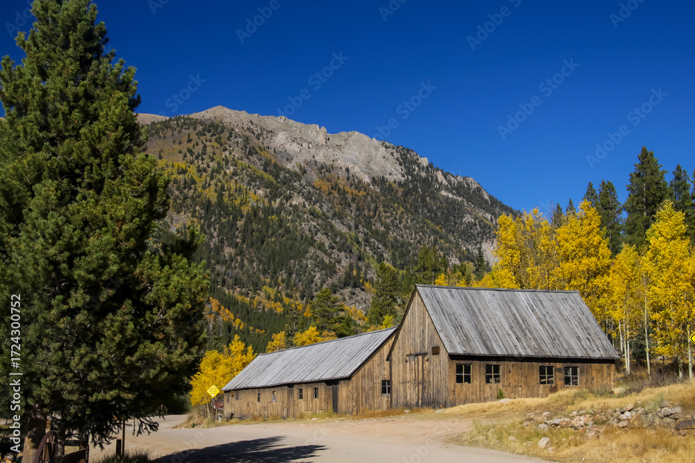 Heritage homes preserved at St. Elmo Ghost town in the middle of Colorado rocky mountains with fall foliage.