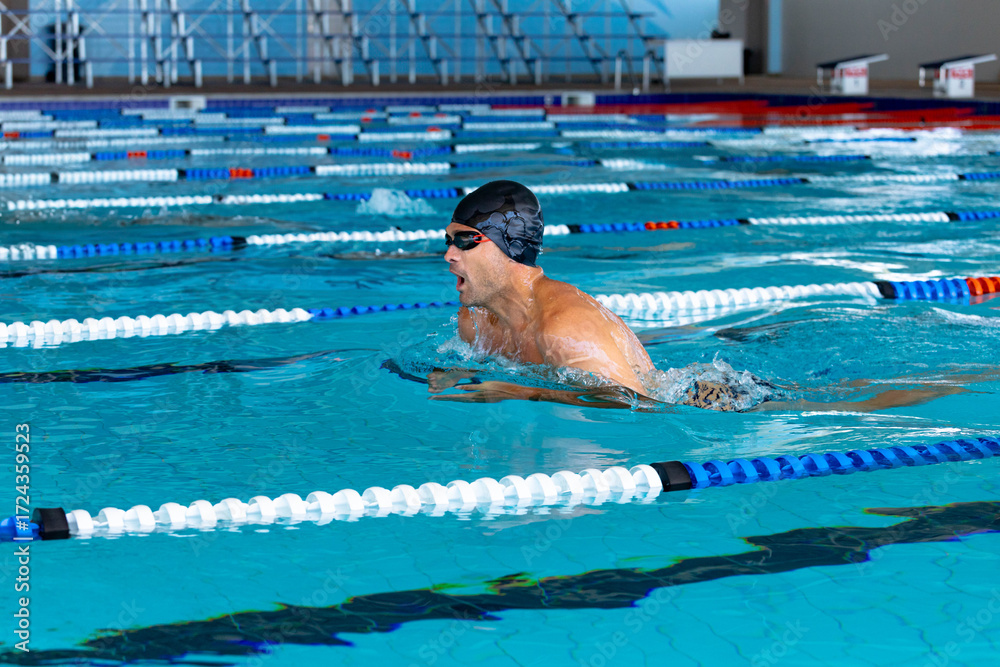 Male swimmer wearing cap and goggles gliding in breaststroke across lap pool toward starting blocks