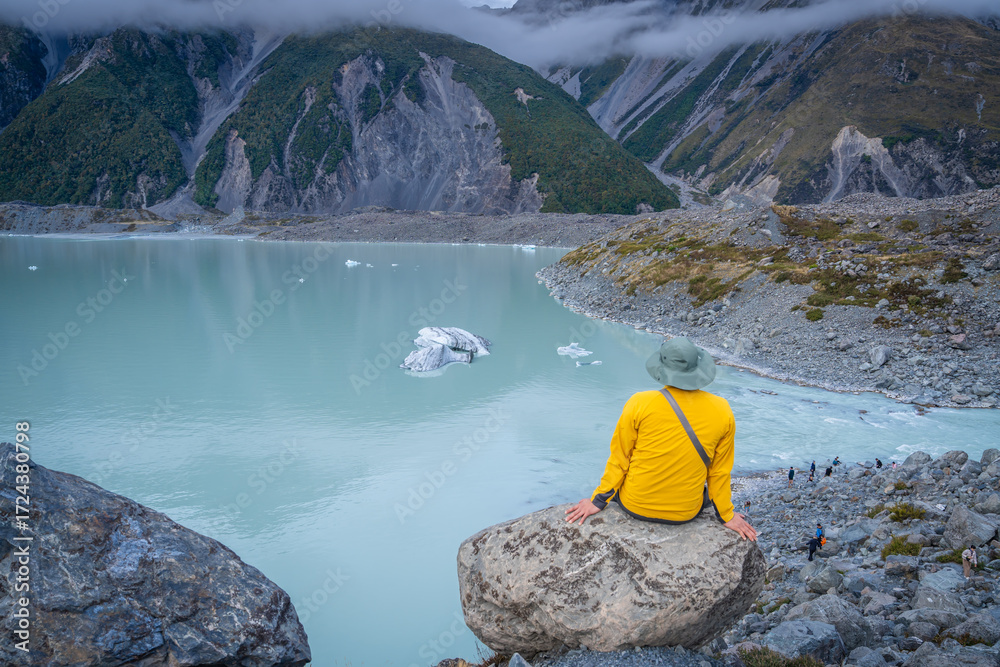 trekking rout where we can see turquoise lake ,snow cap mountain , Glacier ,iceberg ,beautiful Aoraki mt. Cook Hooker Valley track and Tasman lake glacier South Island New Zealand