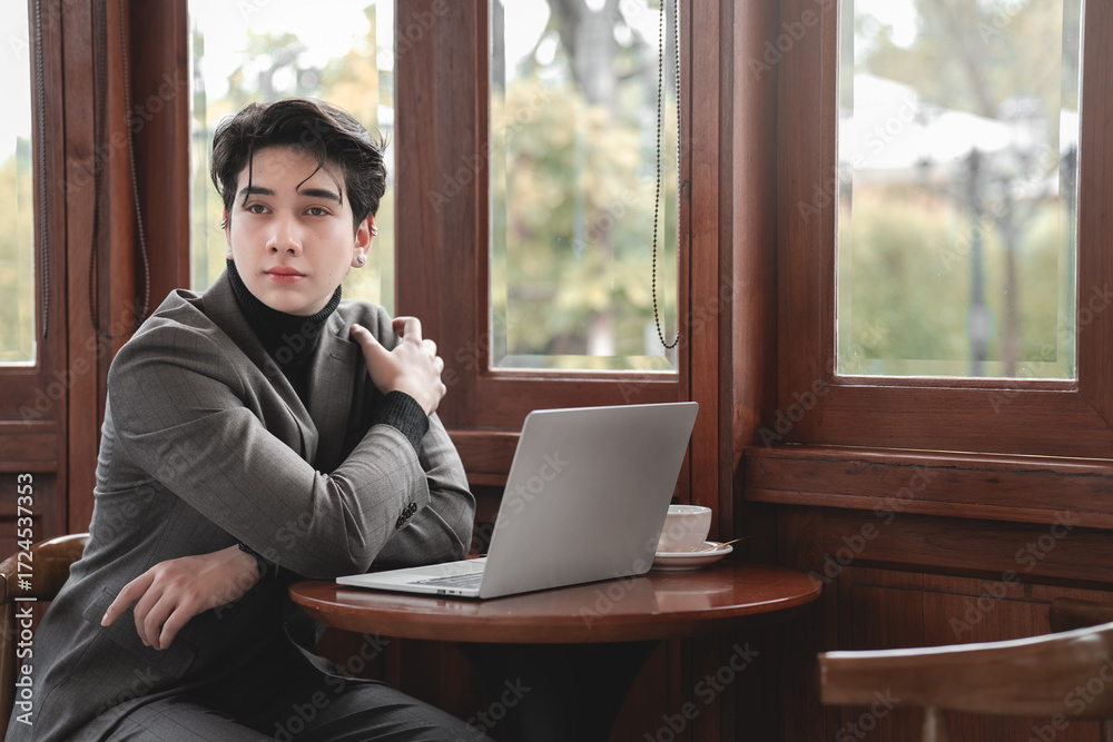 Young Man in Modern Cafe Working on Laptop with Natural Light
