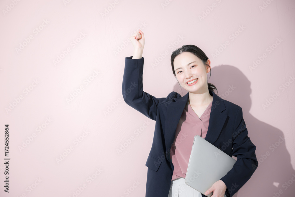 パソコン持ってスーツを着た立つ若いかわいい女性のビジネス上半身 かわいいピンク背景の営業などリクルートのイメージ カメラ目線のガッツポーズ