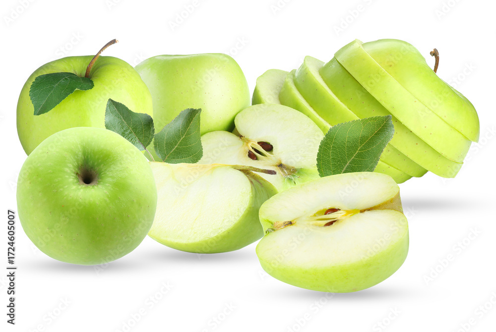 group of green apples with slices on a black backdrop