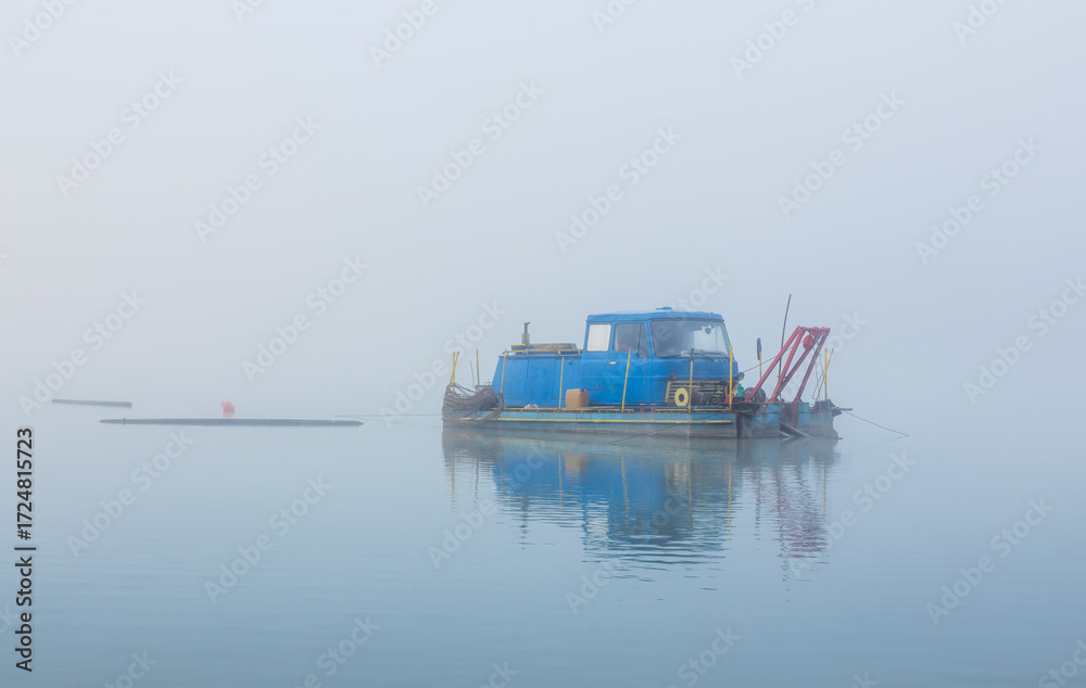 Fishing boat floating on pond with misty fog. Minimalism Czech nature background