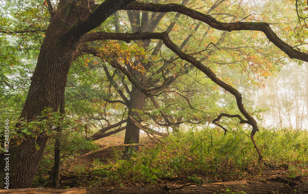 Leaf tree in misty fog forest. Czech woodland summer, spring nature background