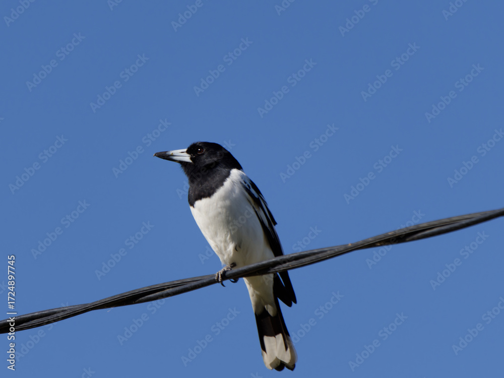 Pied Butcherbird (Cracticus nigrogularis) perched on an overhead power line.