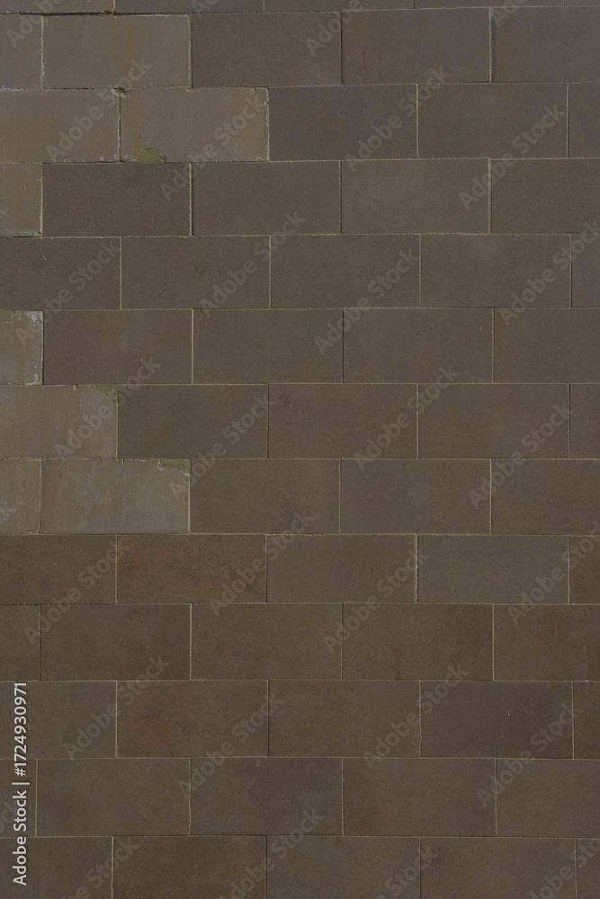 Wall covered with rectangular brown tiles arranged in a staggered pattern. Tile shades vary slightly, with visible wear and moisture marks in some areas.