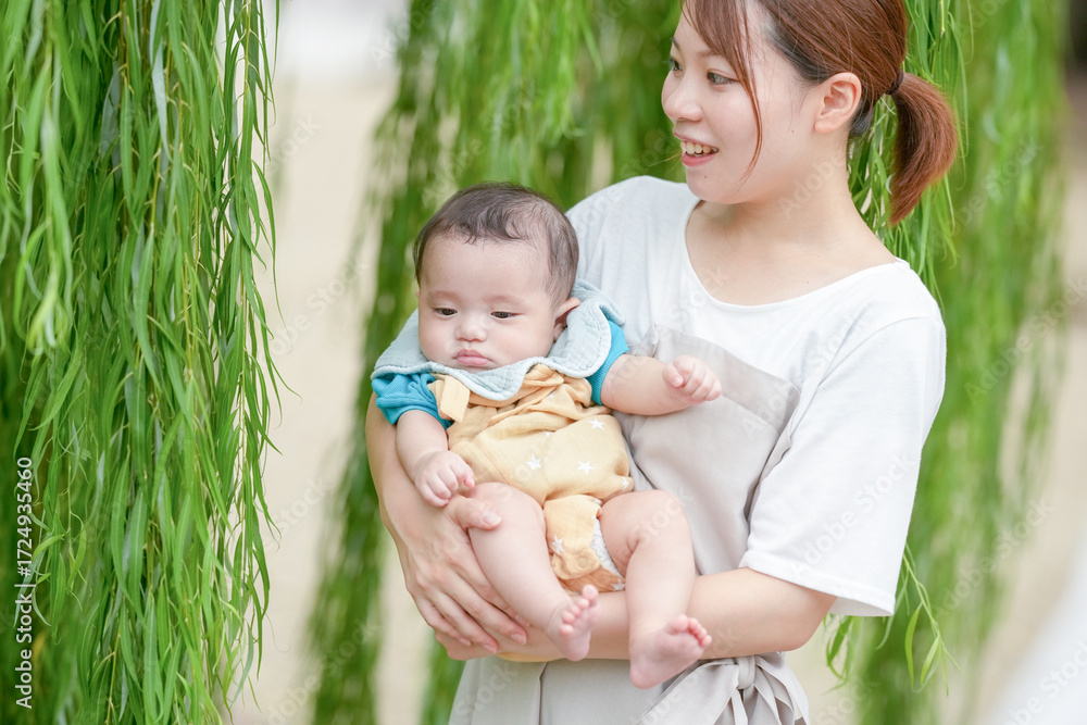 A woman is holding a baby in her arms. The baby is wearing a yellow outfit. Concept of warmth and affection between the mother and child