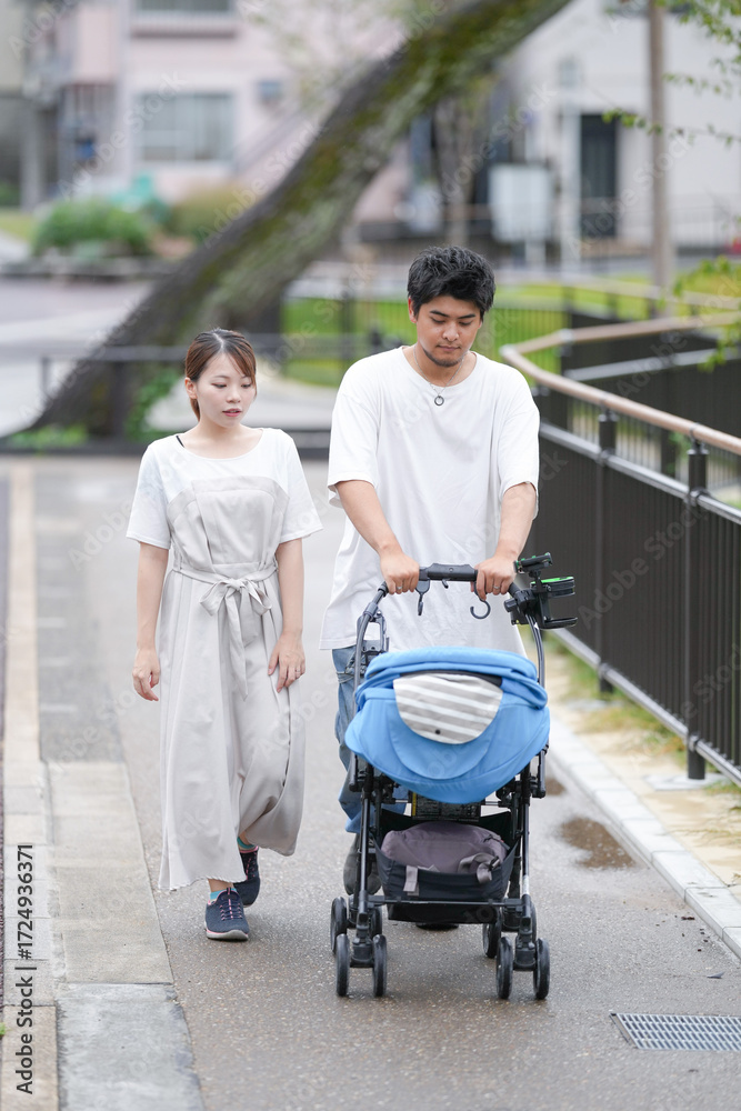 A man and woman are walking down a sidewalk with a baby stroller. The man is pushing the stroller while the woman looks on. The scene is casual and relaxed