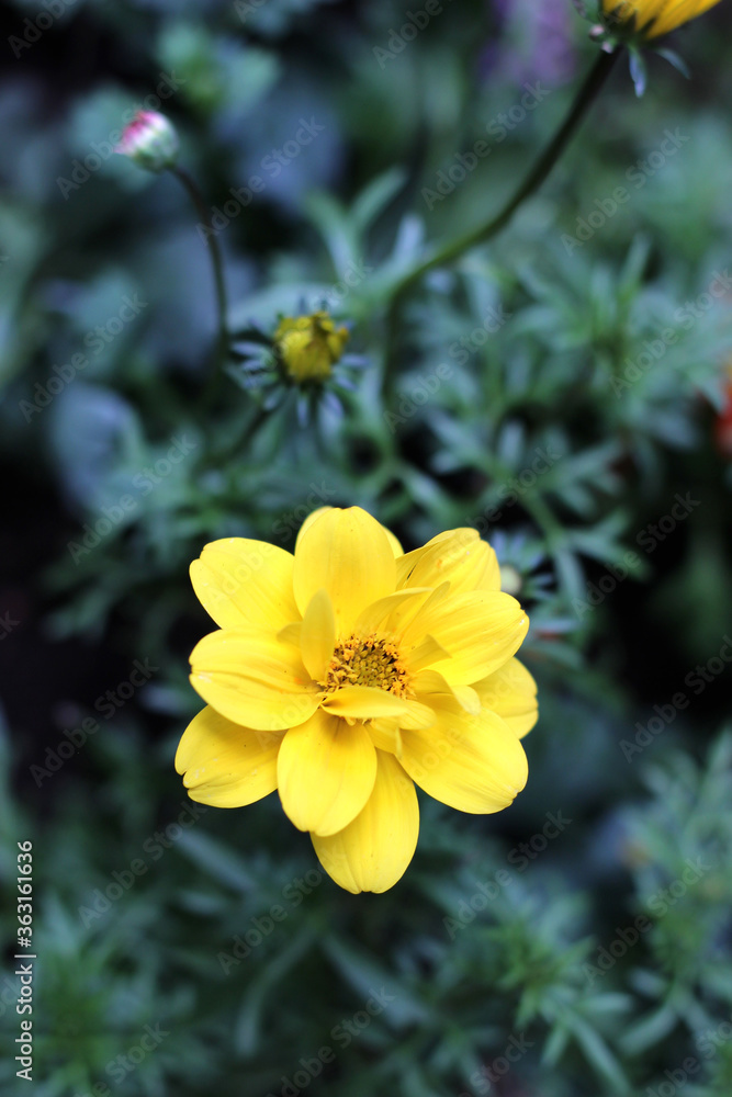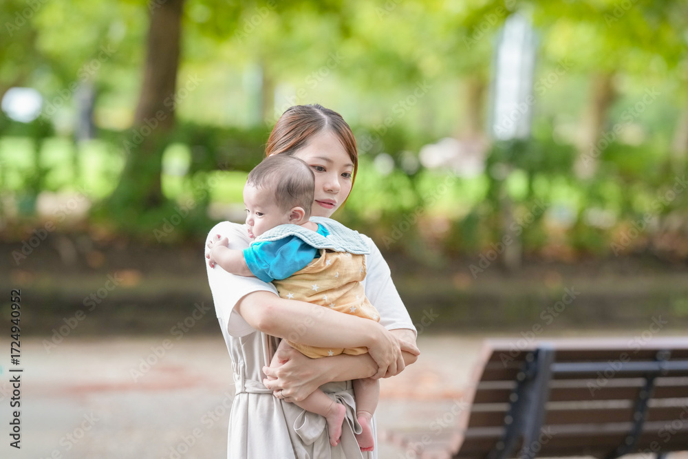 A woman is holding a baby in a park. The baby is wearing a blue shirt and a yellow blanket. The woman is looking at the baby with a smile on her face. Concept of warmth and happiness