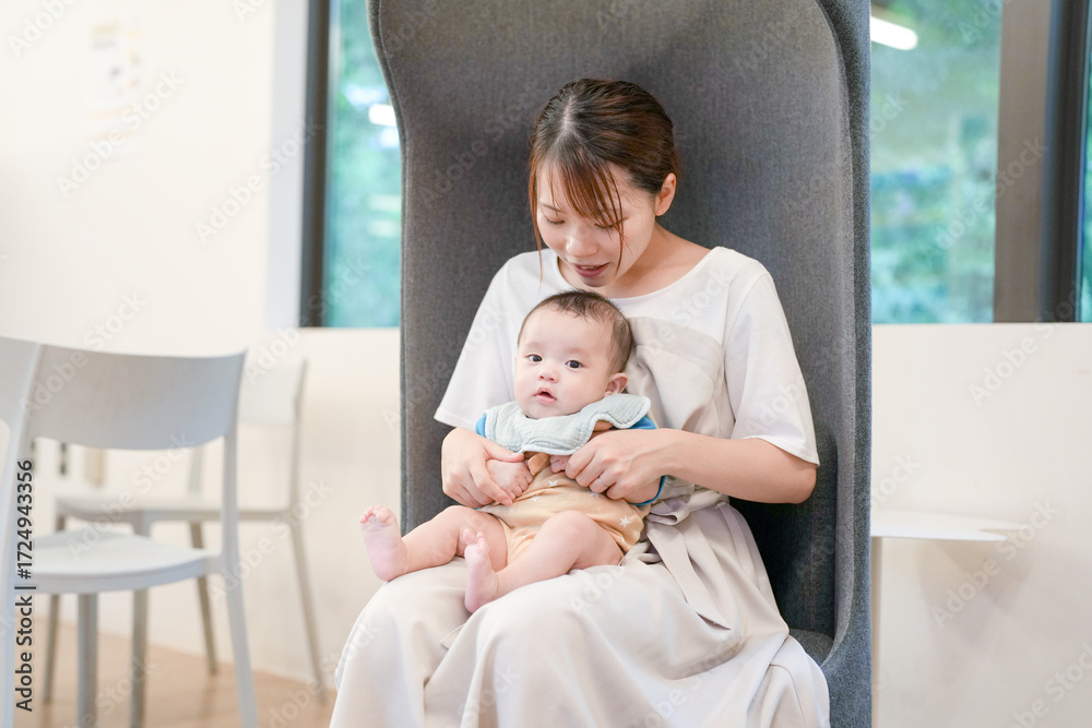 A woman is holding a baby in a chair. The baby is wearing a blue shirt