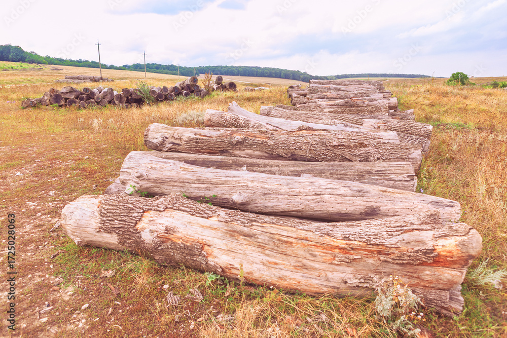 Pile of cut tree logs lies across dry, grassy field under cloudy sky. In distance, more stacked logs and line of trees are visible. Logs stretches across landscape hinting at recent forestry operation