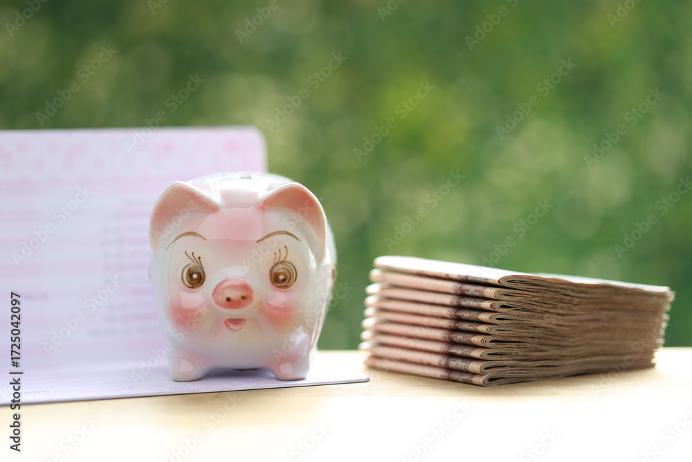 Piggy bank and banking account book on natural green background, Save money for prepare in future and pension retirement concept