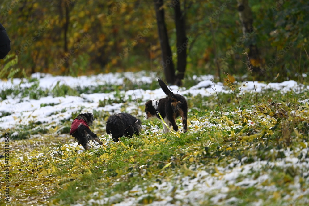 Chiens en laisse dans un bois